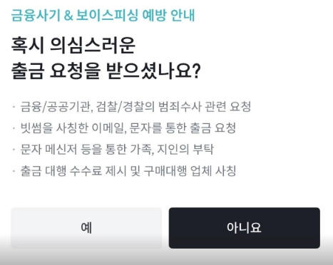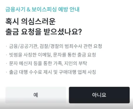 금융사기 & 보이스피싱 예방 안내를 읽으신 후 해당되지 않으시면 아니요를 클릭합니다.