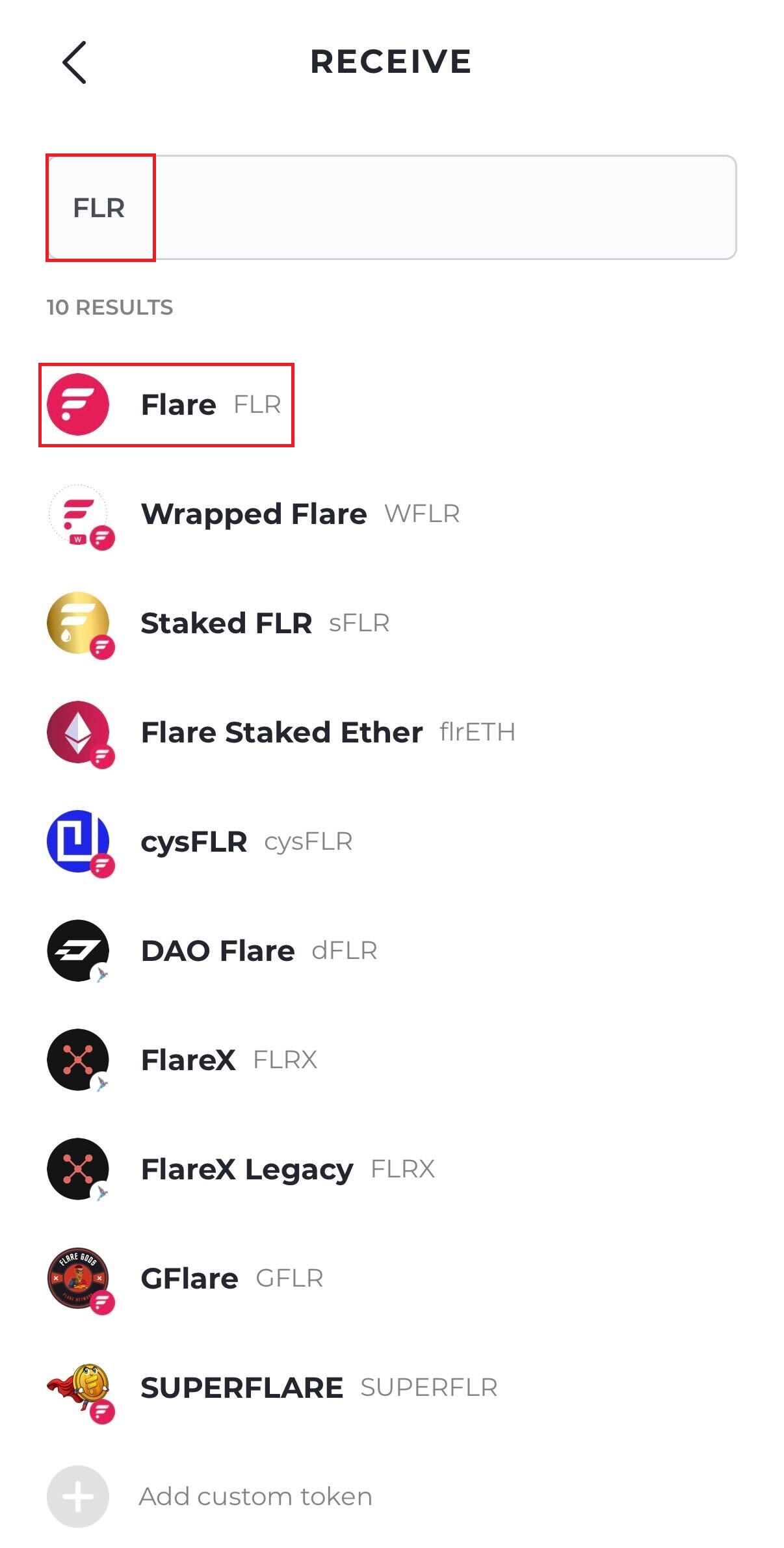 반복 과정을 끝냈다면, 위의 사진 처럼 가상자산 선택 화면이 나옵니다. ‘FLR’을 입력해 플레어 (FLR)가 상단에 나오게 한 뒤 클릭 합니다.