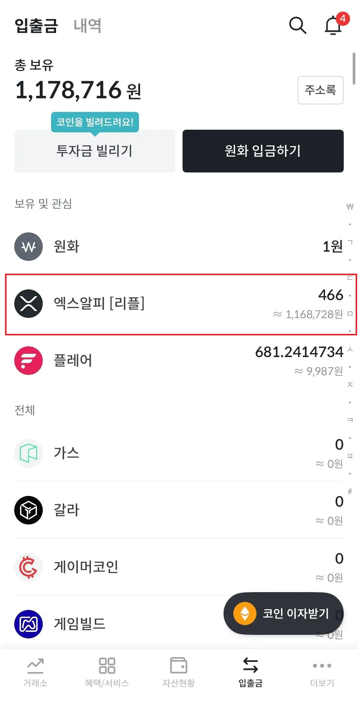 빗썸 모바일 유저 인터페이스에서 하단 입출금 탭을 클릭하면 나오는 화면에서 엑스알피 [리플]을 클릭합니다.