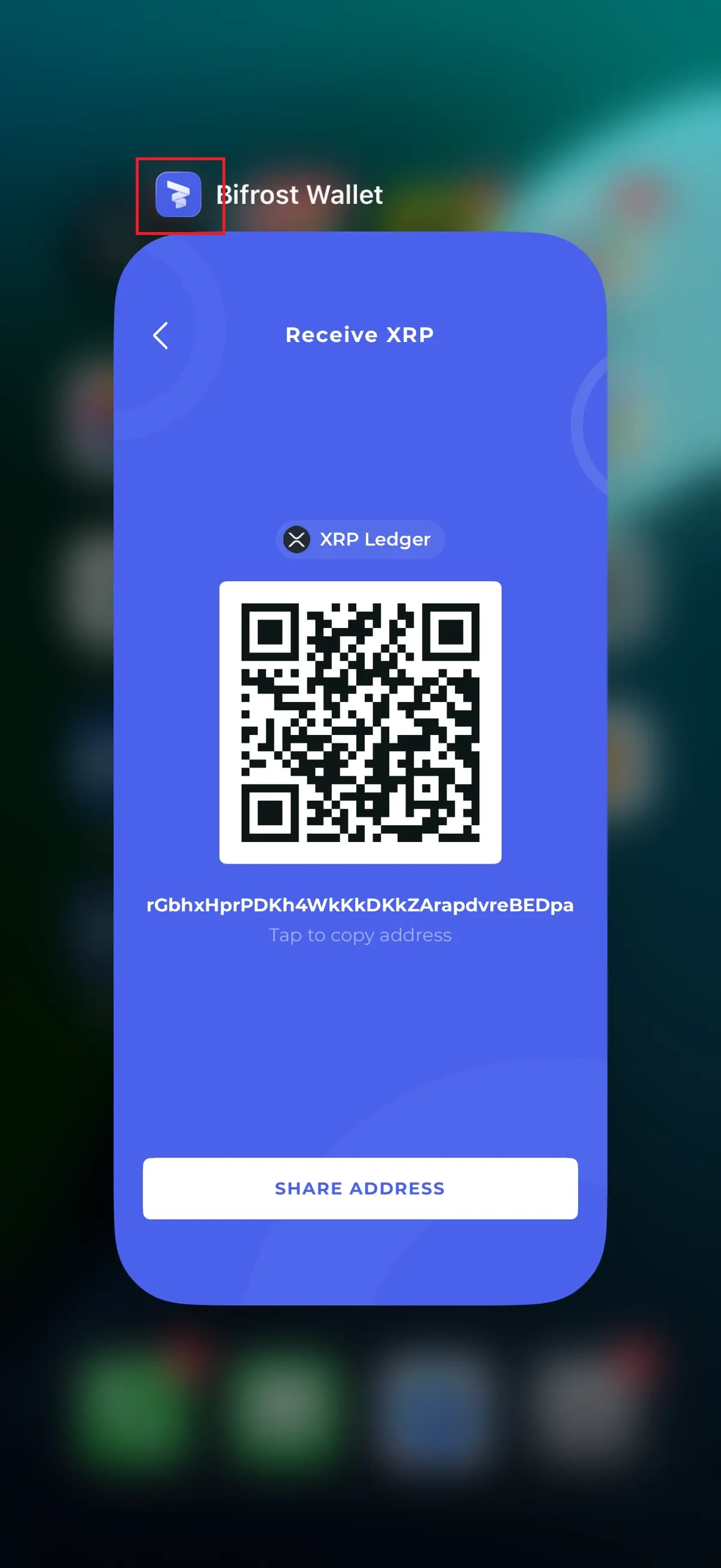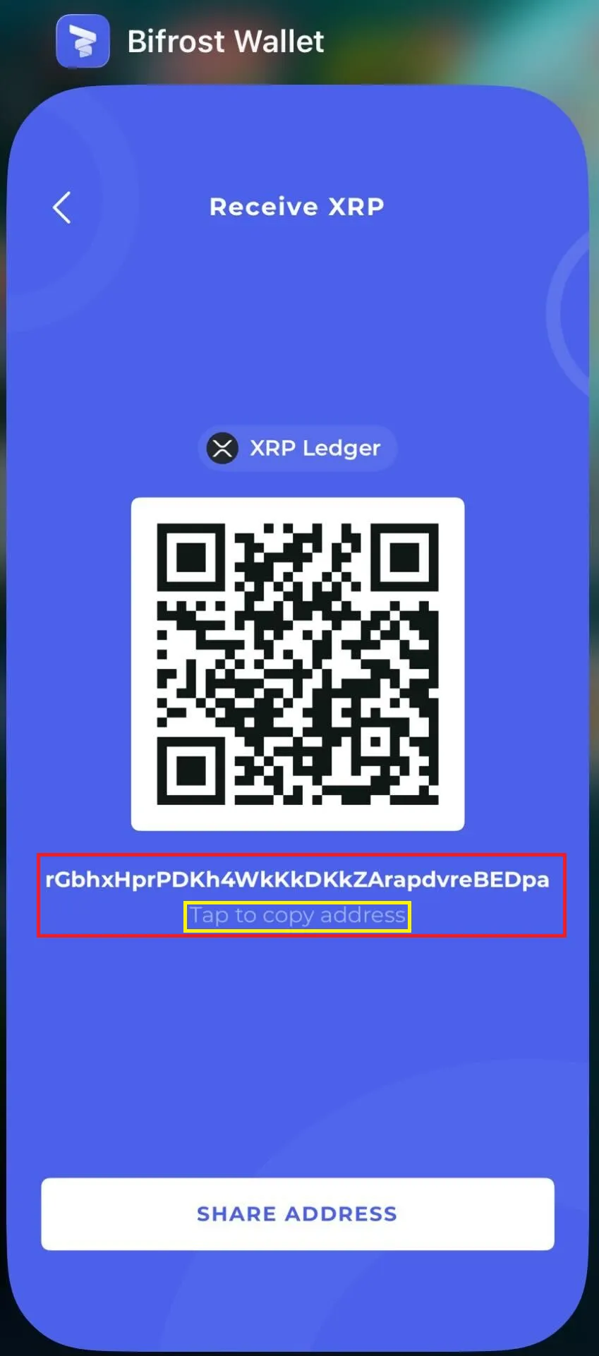 Bifrost Wallet의 XRP Ledger 입금 주소를 ‘Tap to copy address’를 눌러 복사합니다.
