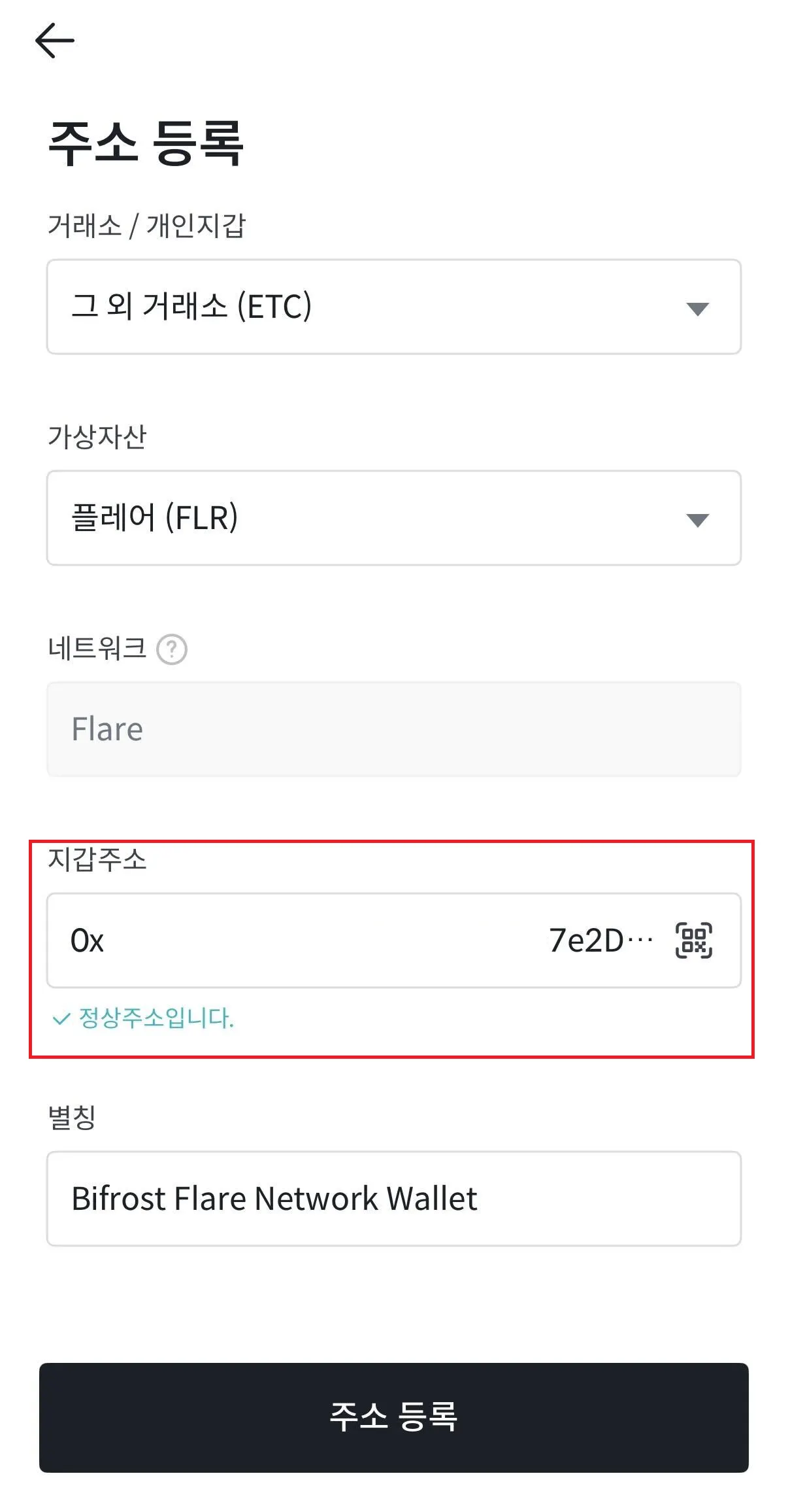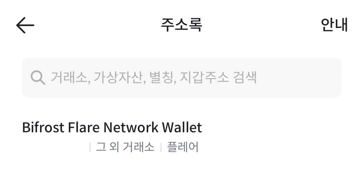가이드를 잘 따라오셨다면 사진처럼 Bifrost Flare Network Wallet (사용자가 설정한 지갑 별칭) → 심사중 이라는 항목이 주소록에 업로드 될 것 입니다.