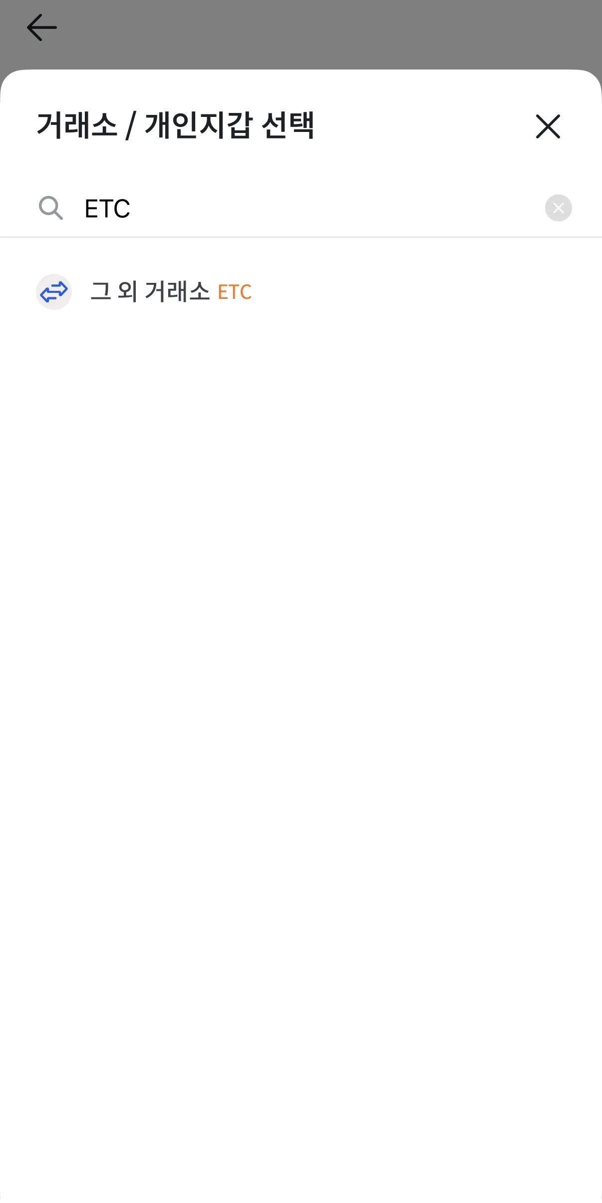 거래소 / 개인지갑 선택 화면의 검색창에 ETC를 입력해 그 외 거래소 (ETC)를 나오게 한 뒤, 클릭 합니다.