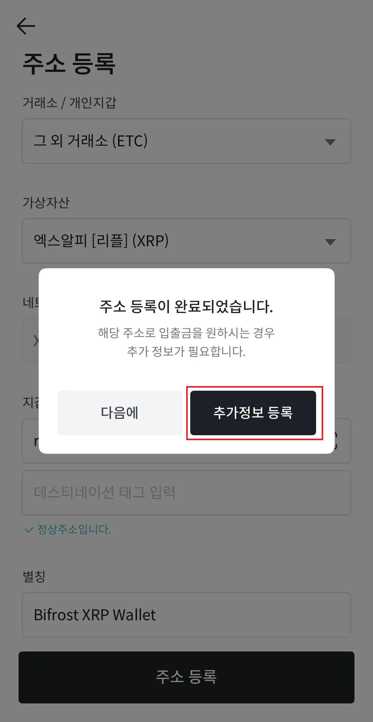 XRP Ledger 출금 주소 등록할 때의 과정 1, 2, 3, 4을 반복합니다. (클릭하면 해당 과정을 볼 수 있습니다.)