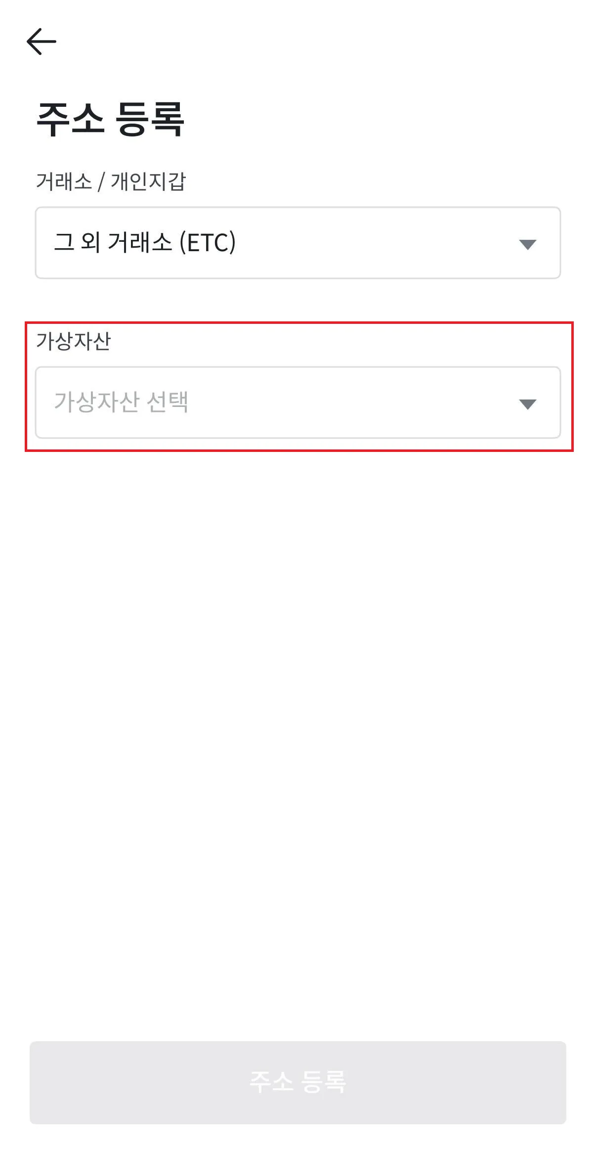 가상자산 선택 토클을 클릭합니다.