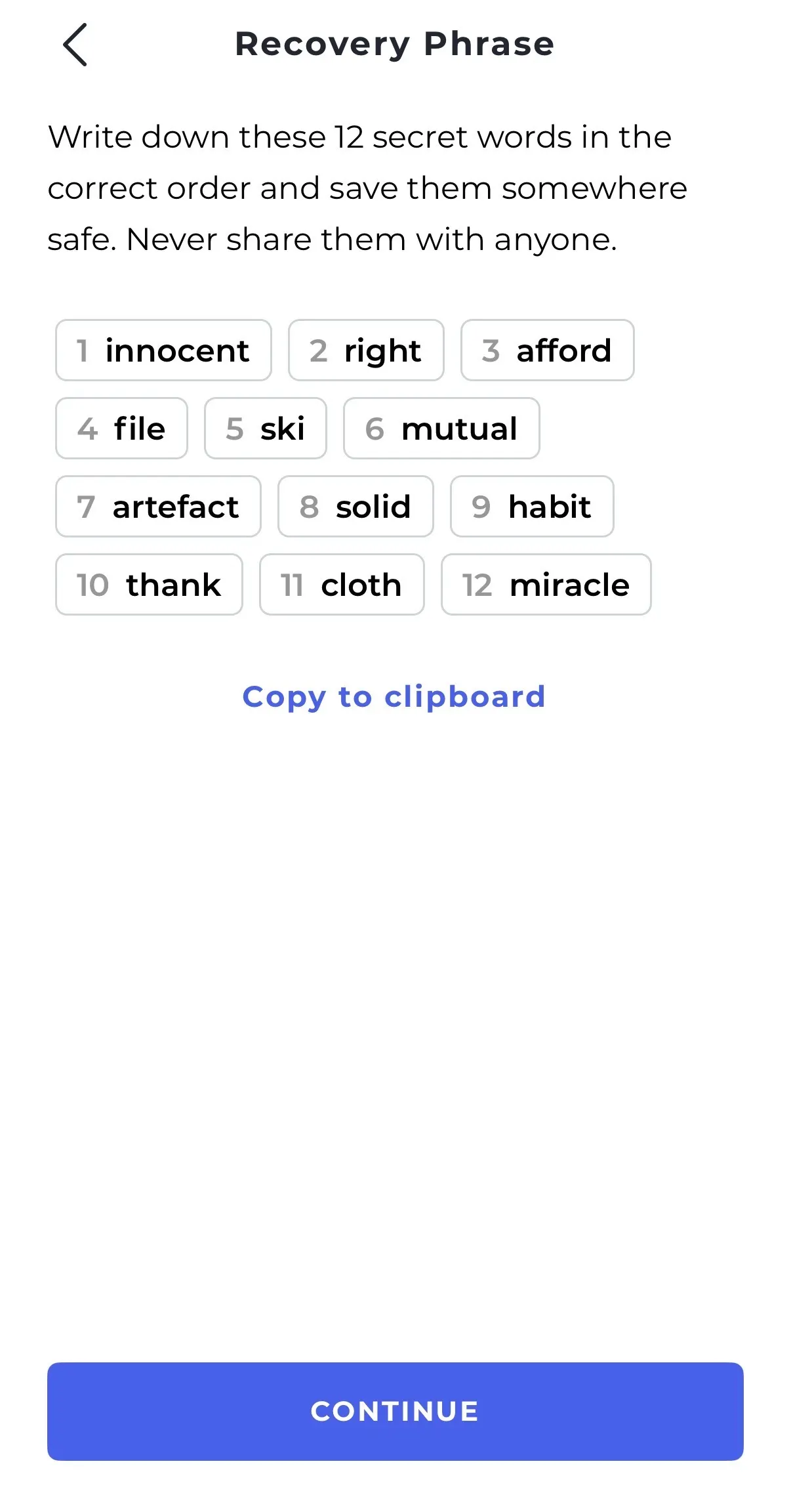*주의 : 비수탁이 내포하는 의미는 자산의 관리 주체는 나 자신이며 전통 금융에서 수탁의 역할을 하는 은행과 같은 주체가 없다는 것을 의미합니다. 이 복구 문구의 소유자가 곧 해당 월렛 안에 보관되어 있는 모든 자산에 대한 권리를 가지게 되는 것입니다. 따라서 분실 시 나를 대신해서 해당 자산을 복구해주는 주체가 없고 해당 지갑 안에 보관되어 있는 자산에 대한 통제권도 잃어버리게 됩니다. 전자기기에 사진 파일 형태로 저장하지 마시고 자신만이 아는 곳에 종이에 적어서 안전하게 보관하시기 바랍니다.