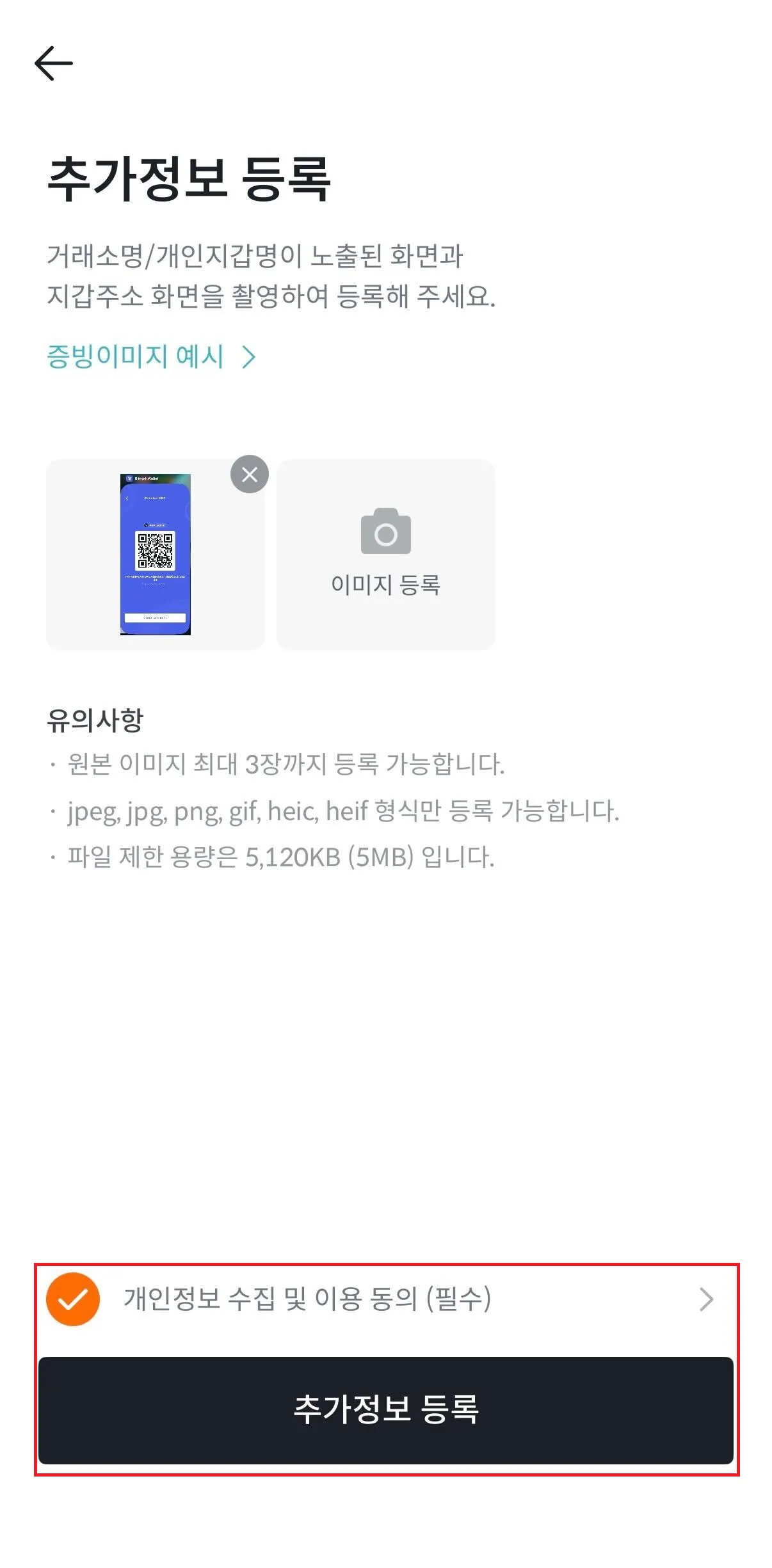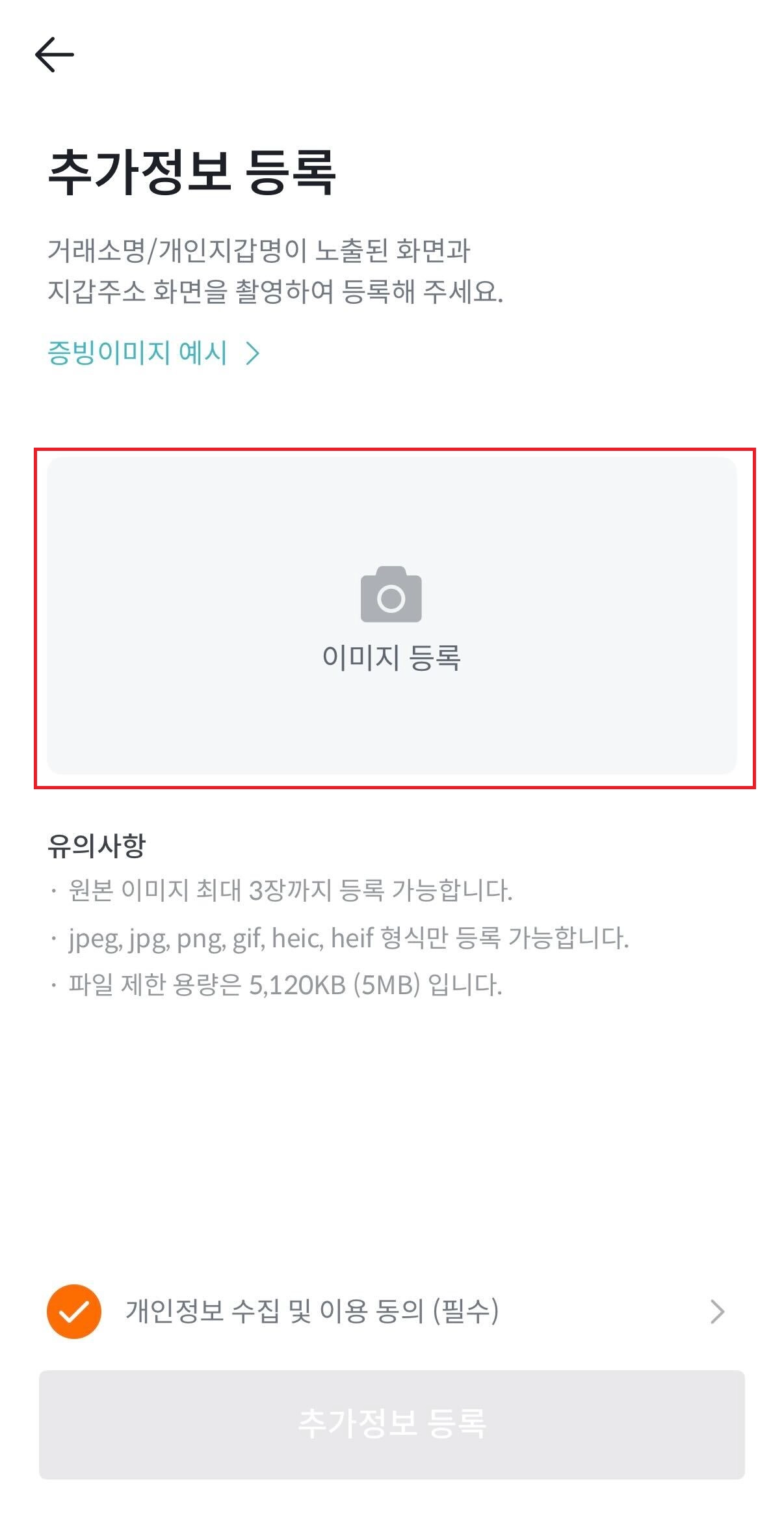 사진처럼 성공적으로 사진을 업로드 했다면, 개인정보 수집 및 이용 동의를 누르고 추가 정보 등록을 합니다.