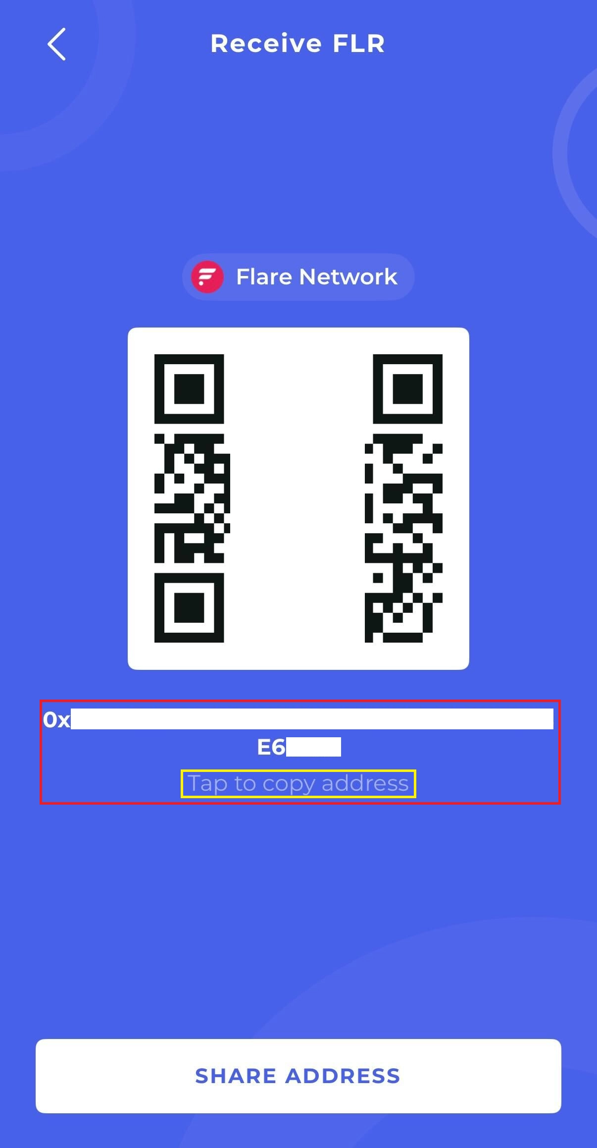 Bifrost Wallet의 Flare Network 입금 주소를 ‘Tap to copy address’를 눌러 복사합니다.