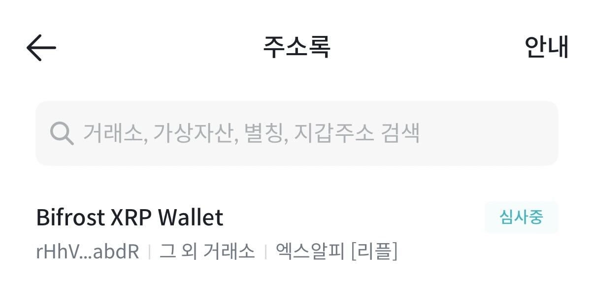가이드를 잘 따라오셨다면 사진처럼 Bifrost XRP Wallet (사용자가 설정한 지갑 별칭) → 심사중 이라는 항목이 주소록에 업로드 될 것 입니다.