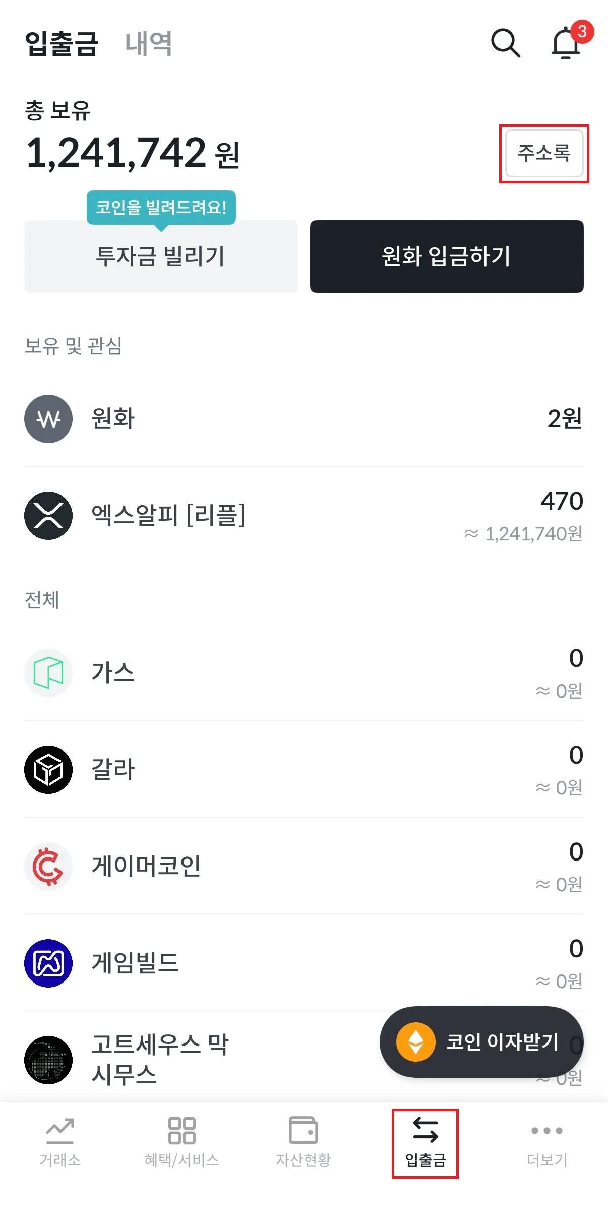 빗썸 모바일 앱 UI에서 하단에 ‘입출금’을 클릭합니다. 사진처럼 나타난 새로운 화면의 우측 상단 ‘주소록’을 클릭합니다.