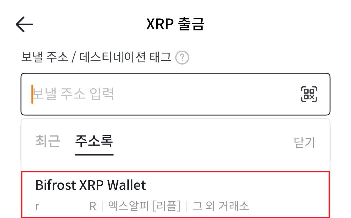전에 출금 주소로 등록한 Bifrost XRP Wallet이 저장되어 있을 것 입니다. (본인이 설정한 별칭으로)