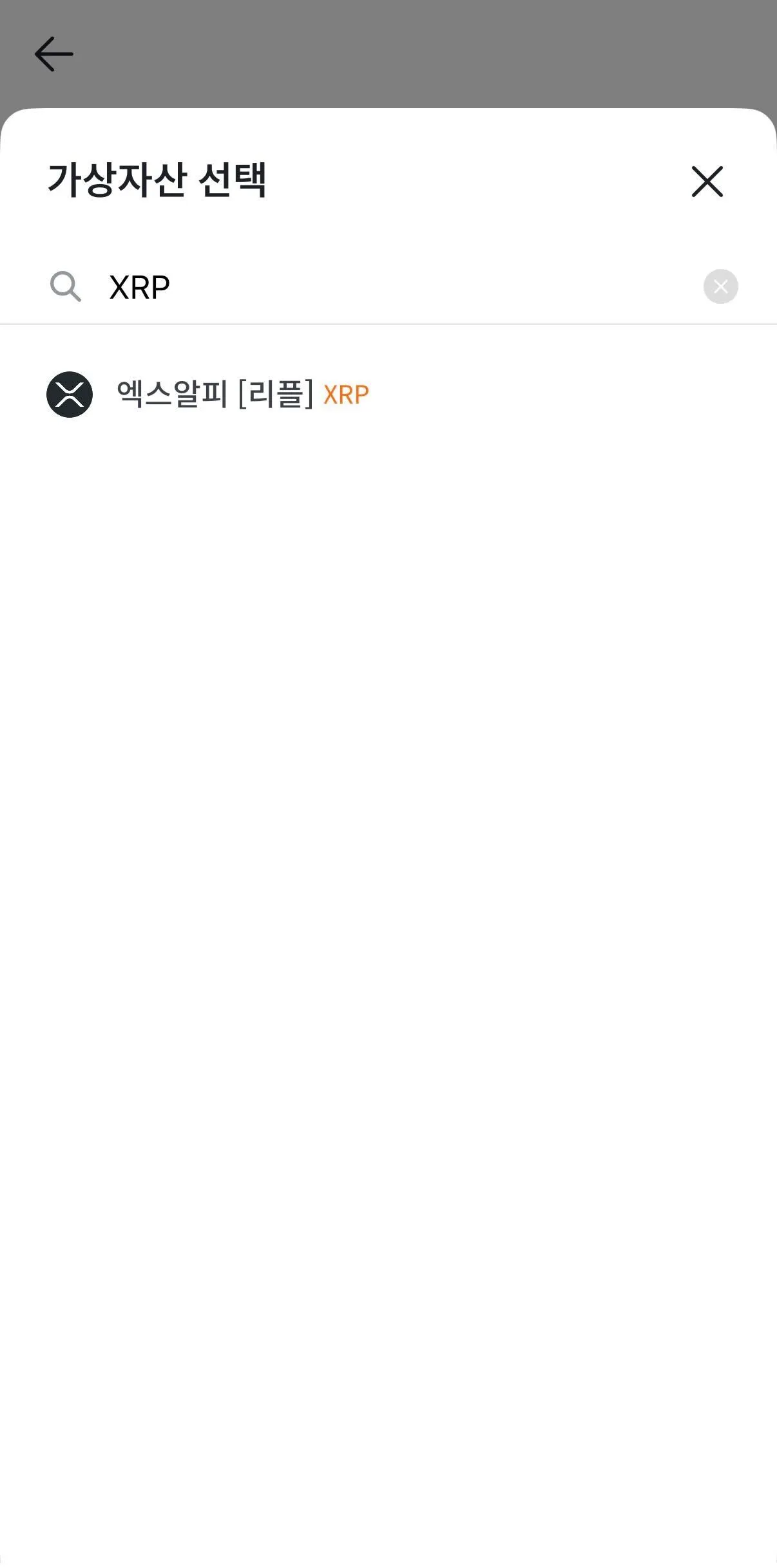 가상자산 선택 화면의 검색창에 XRP를 입력해 엑스알피 [리플] (XRP)가 나오게 한 뒤, 클릭합니다.