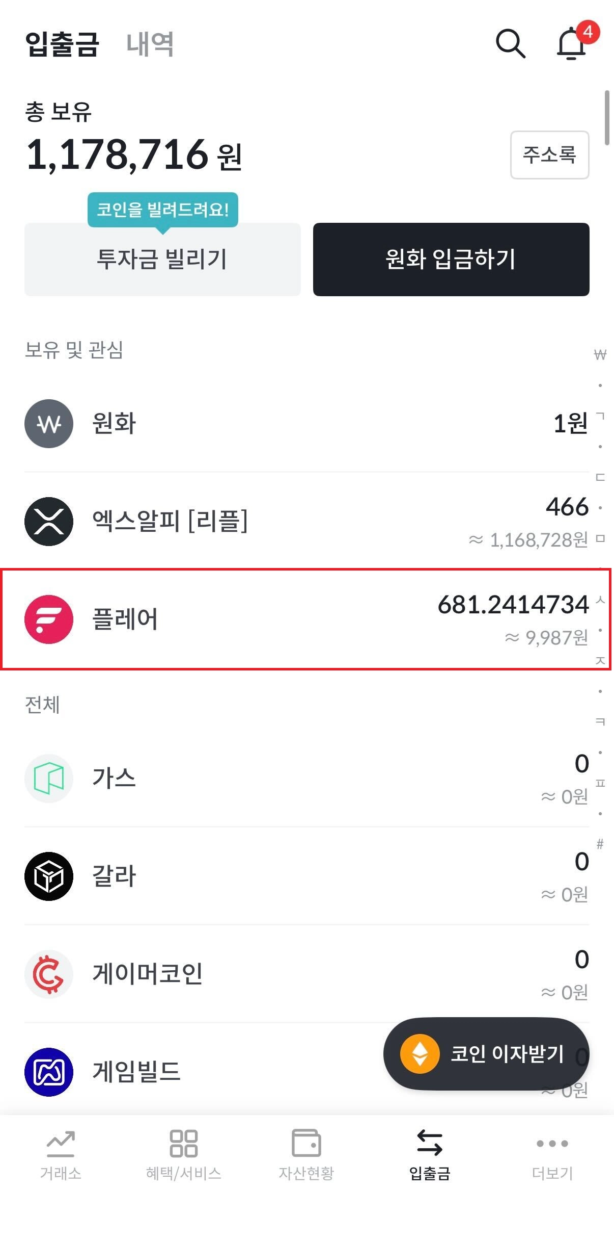 빗썸 모바일 유저 인터페이스에서 하단 입출금 탭을 클릭하면 나오는 화면에서 플레어를 클릭합니다.