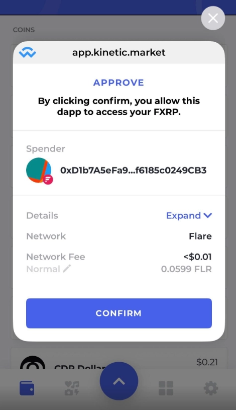 만약, Bifrost Wallet 모바일 앱에서 성공적으로 Approve 트랜잭션을 보냈는데도 PC 화면에서 Approving FXRP 트랜잭션을 대기하고 있다는 메세지가 오랫동안 사라지지 않으면 (보통 Approve 트랜잭션을 보낸 후 몇십초 이내로 사라짐) Kinetic Defi App이 켜져 있는 브라우저를 새로고침하시고 1번부터 7번까지 반복해주세요.