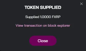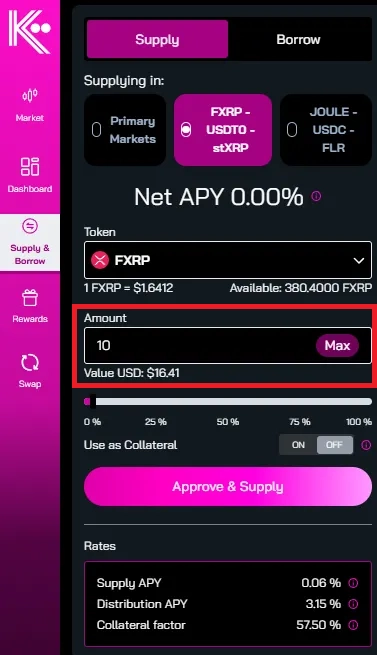 Token 항목에 FXRP가 잘 선택되었는지 확인 후, Kinetic 프로토콜에 예치할 FXRP 수량을 입력합니다.