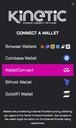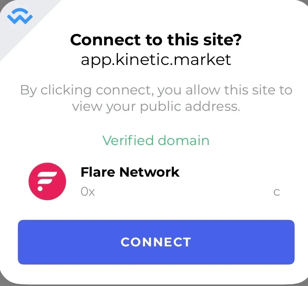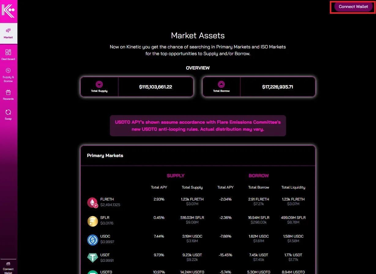 다음 링크를 클릭하여 (https://app.kinetic.market/) Kinetic Flare 공식 앱에 접속합니다. 화면 우측 상단의 Connect Wallet을 클릭합니다.