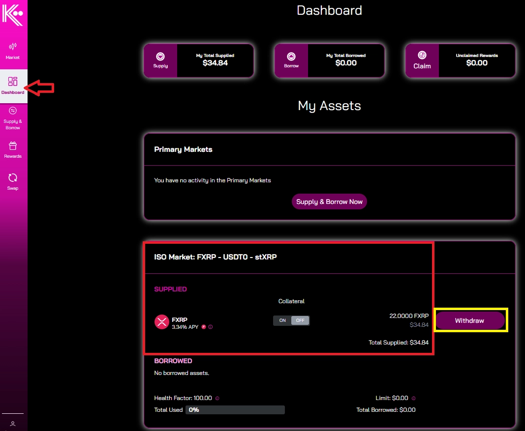 만약, 더 이상 예치하고 싶지 않고 FXRP를 Kinetic에서 출금하고 싶으시다면, 노란색 박스로 표시된 Withdraw 버튼을 누른 뒤 출금할 수량을 입력하시고 출금 트랜잭션을 진행, 승인 해주세요.