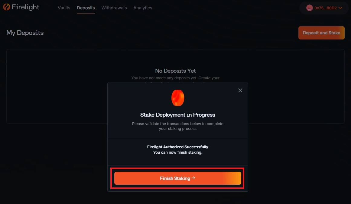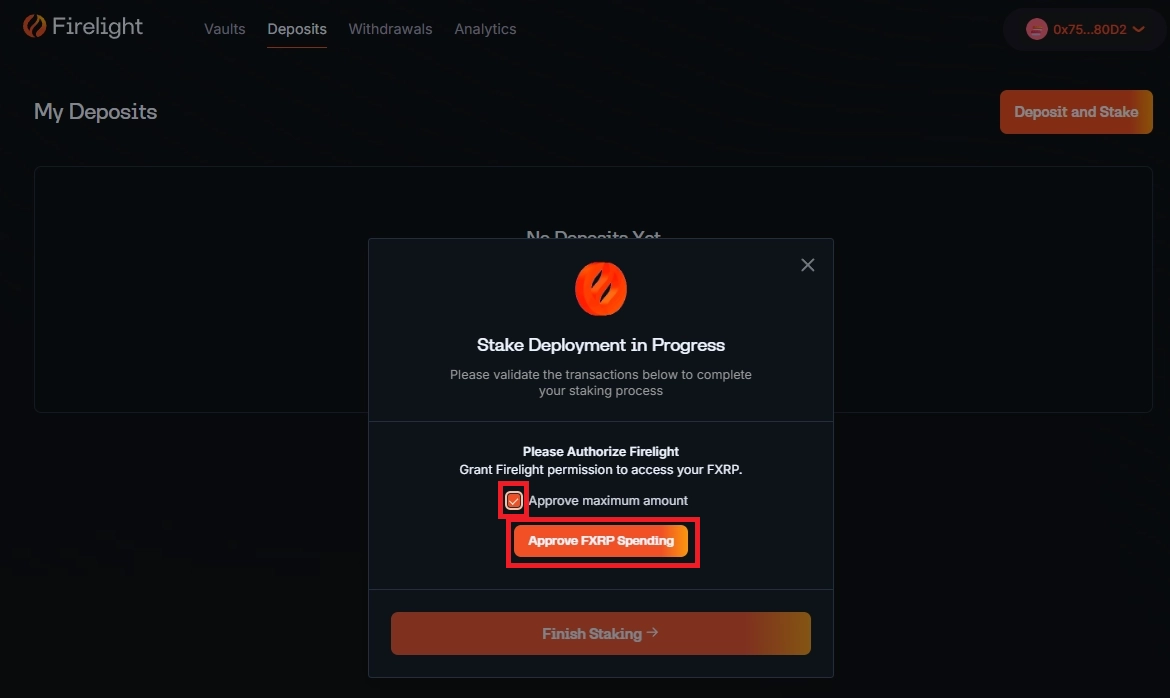 6번의 트랜잭션을 성공적으로 실행시키셨다면, Finish Staking을 눌러줍니다. 이는 실제로 사용자의 지갑에서 FXRP를 Firlight Vault에 디파짓 & 스테이킹하고 stXRP를 민팅하기 위한 트랜잭션을 일으키기 위한 과정입니다.