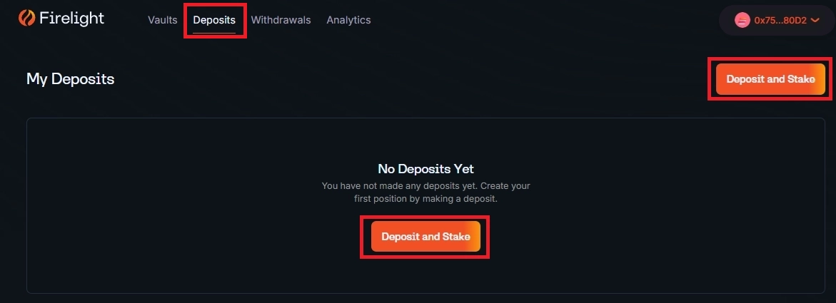 왼쪽 상단의 Deposits를 클릭하셔서 다음과 같은 화면이 나오셨다면 이제 Deposit and Stake 버튼을 클릭합니다.