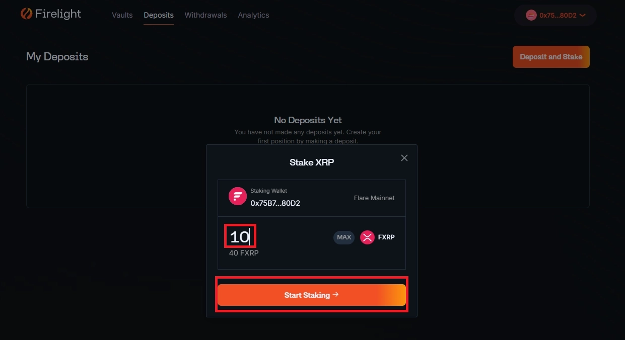 Deposit하고 Stake할 FXRP 개수를 입력합니다. Start Staking을 클릭합니다.