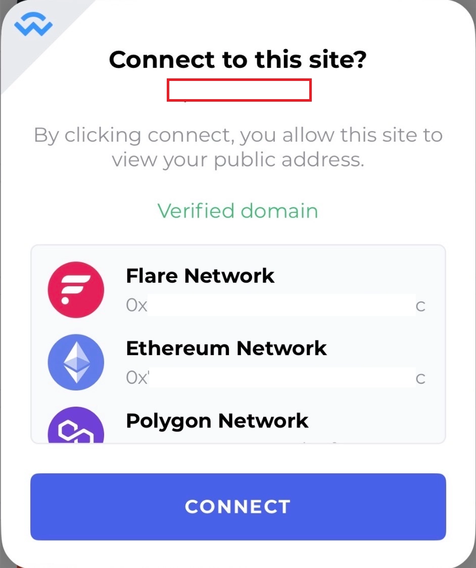 스캔이 성공적으로 이루어지면, Connect to this site? 란 메세지와 함께 지갑 연결 승인 창이 뜨게 됩니다. 인증된 도메인이라고 뜨는지 (Verified domain) 그리고 공식 웹사이트와 연결 하려고 하는지 (빨간색 네모 부분 스펠링 확인) 확인하시고 지갑 연결 진행하시기 바랍니다.