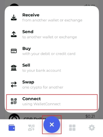 WalletConnect를 클릭하세요. 각 탈중앙화 Dapp마다 사진과 다른 지갑 연결 UI를 가질 수 있습니다. WalletConnect만 찾아서 누르시면 됩니다.